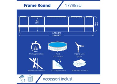 Questa splendida piscina si assembla in meno di 15 minuti ed è facile da smontare e compattare per conservarla nel migliore dei modi durante la stagione invernale. La piscina viene consegnata con le istruzioni e consigli di manutenzione ed un kit di riparazione. Completano il set una pompa filtro elettrica con la sua cartuccia.