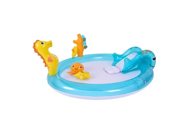 Originale e Divertente Piscina Gonfiabile a tema Animali Marini con spruzzatore d'acqua integrato scivolo e giochi gonfiabili compresi. Dimensioni: 200x152x40cm. Realizzata in PVC, è sicura e resistente, facile e veloce da gonfiare, sgonfiare e riporre. Pronta all'uso in pochi minuti. Perfetta per il divertimento dei più piccoli.